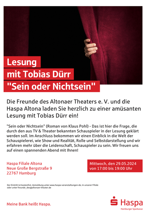 Tobias Dürr liest vor und steht für eine Gesprächsrunde über die Themen der Schauspielerei, wie Rolle und Selbstdarstellung, Show und Realität, Leidenschaft und Druck zur Verfügung.